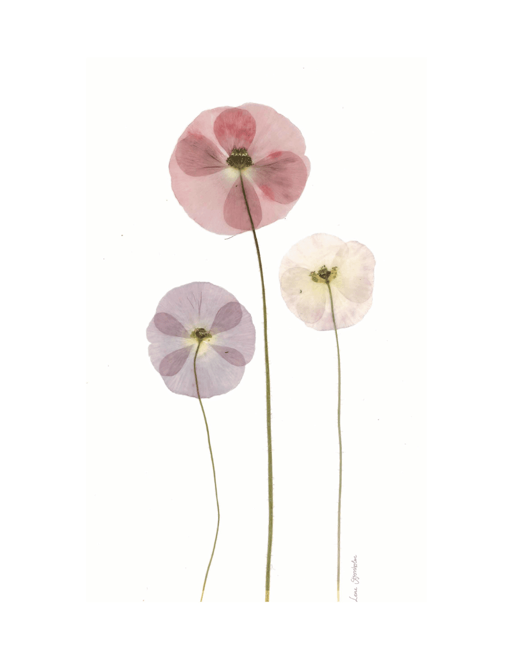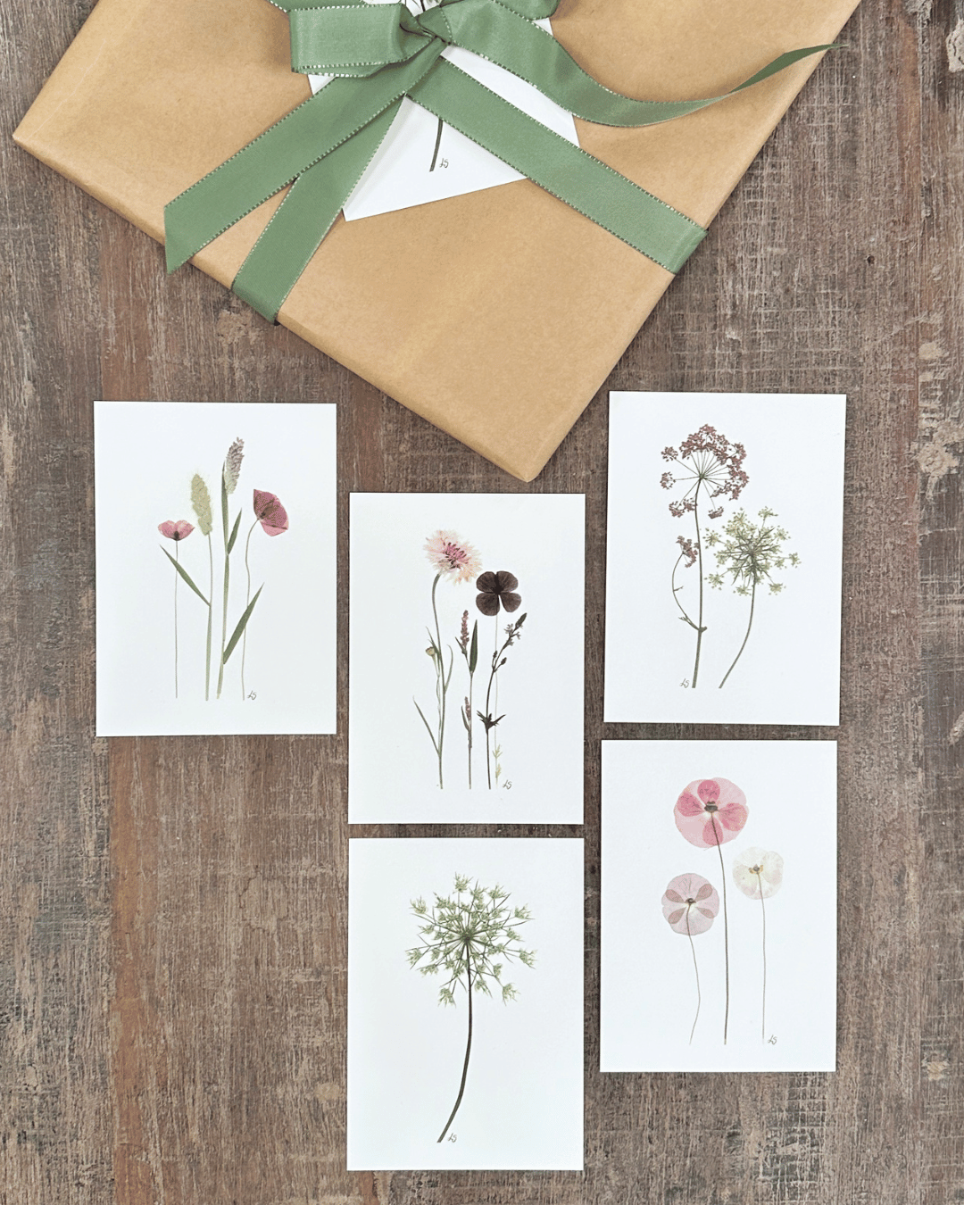 A6 kort med smukke blomstermotiver. Print af originale værker med pressede blomster.