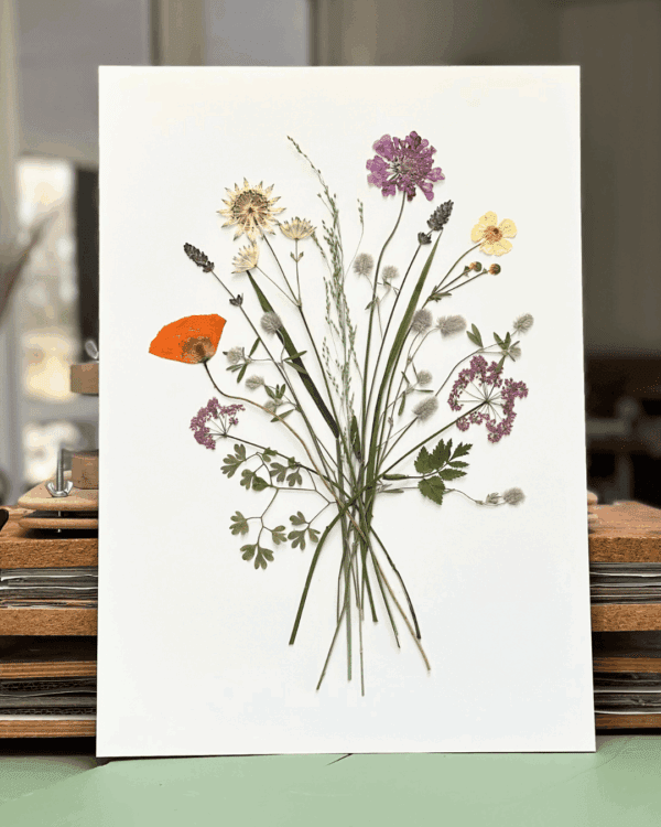 Blomsterne er indsamlet og presset i min egen have i løbet af sommeren – og nu er de samlet til mit bud på en 2025 buket – klar til at give til en du holder af.