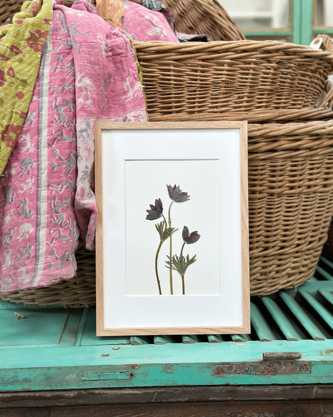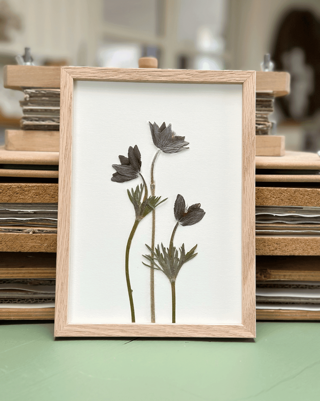 Blomsterne i værket er Kobjælder, som blomstrer i april og maj – plukket og presset i min egen have i sommeren 2024