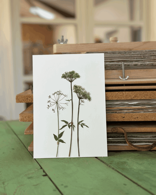 Blomsterne i værket er Skvalderkål – plukket og presset i min egen have i sommeren 2024