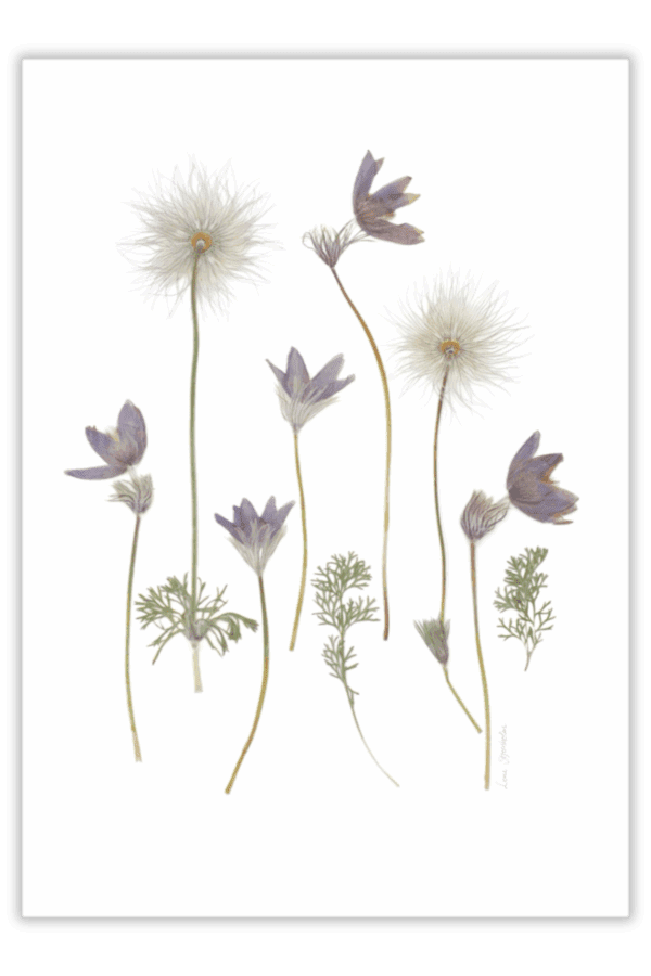 Kobjælderne og deres meget dekorative frøstande i dette værk er plukket og presset i foråret 2022 ved Mulbjerge i Vendsyssel.