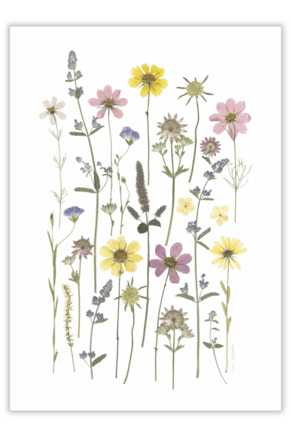 Blomsterne i værket er: Stjerneskærm, Cosmo, Scabiose, Katteurt og Hør