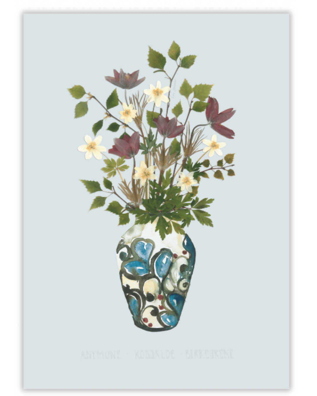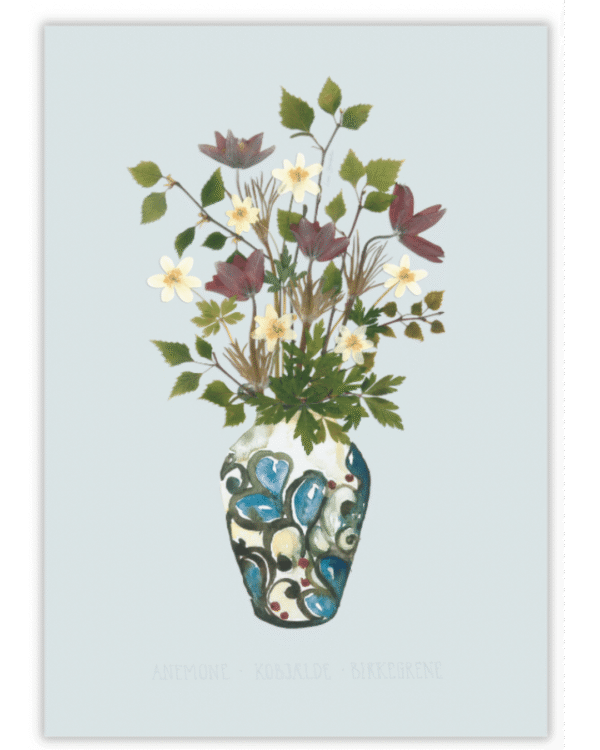 Buketten er sammensat af; Anemoner, kobjælder og birkegrene