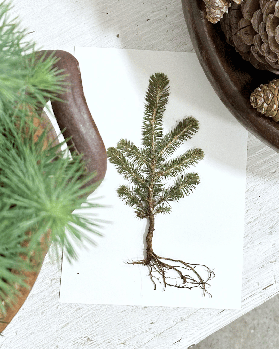 Print af lille selvsået presset grantræ – indsamlet og presset i min skov – ej ikke helt min skov – men der hvor jeg ofte går mig en tur.