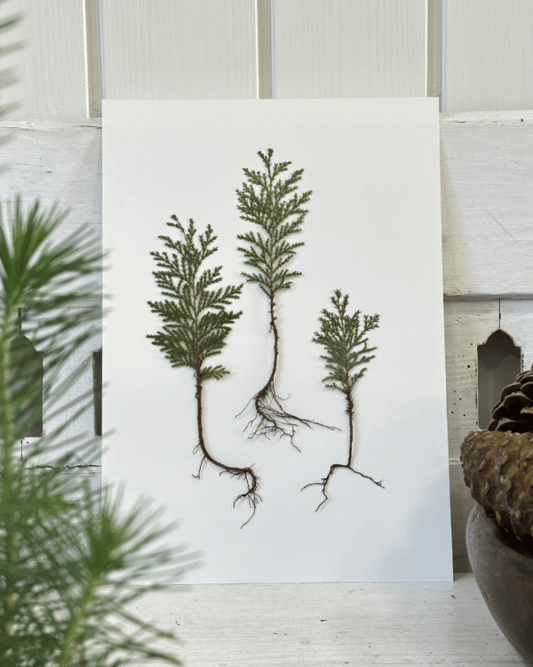 Print af små pressede selvsåede tujaer – indsamlet og presset i min skov – ej ikke helt min skov – men der hvor jeg ofte går mig en tur.